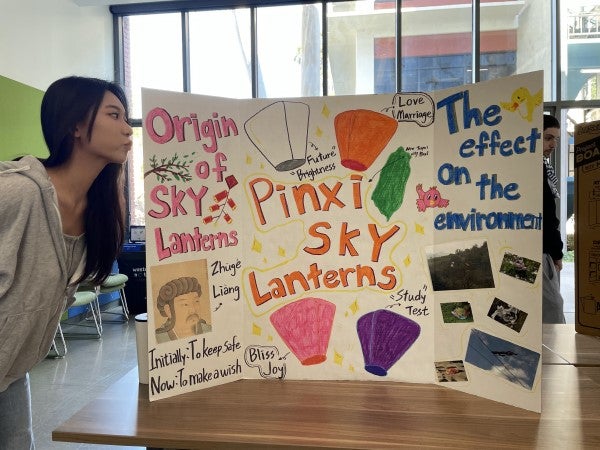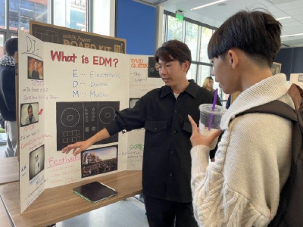 Through these presentations, each student brought a piece of their home countries to The Beach—from Japan, Taiwan, and South Korea, to Turkey, Palestine, Ukraine, and many others. A few days before their presentations, the students gathered in their ALI classroom to get ready by drawing, discussing, cutting, pasting, and polishing their posters. The wide variety of subjects included Japanese contemporary art, Korean street foods, wind surfing, travel to Rio de Janeiro, electronic dance music (EDM), Cantonese opera, the Dead Sea, and much more.