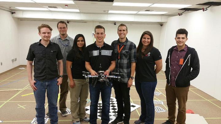 Photo caption: Marcea and the EE cohort at NASA Armstrong performing an indoor test of the navigation system they put on a quadcopter.